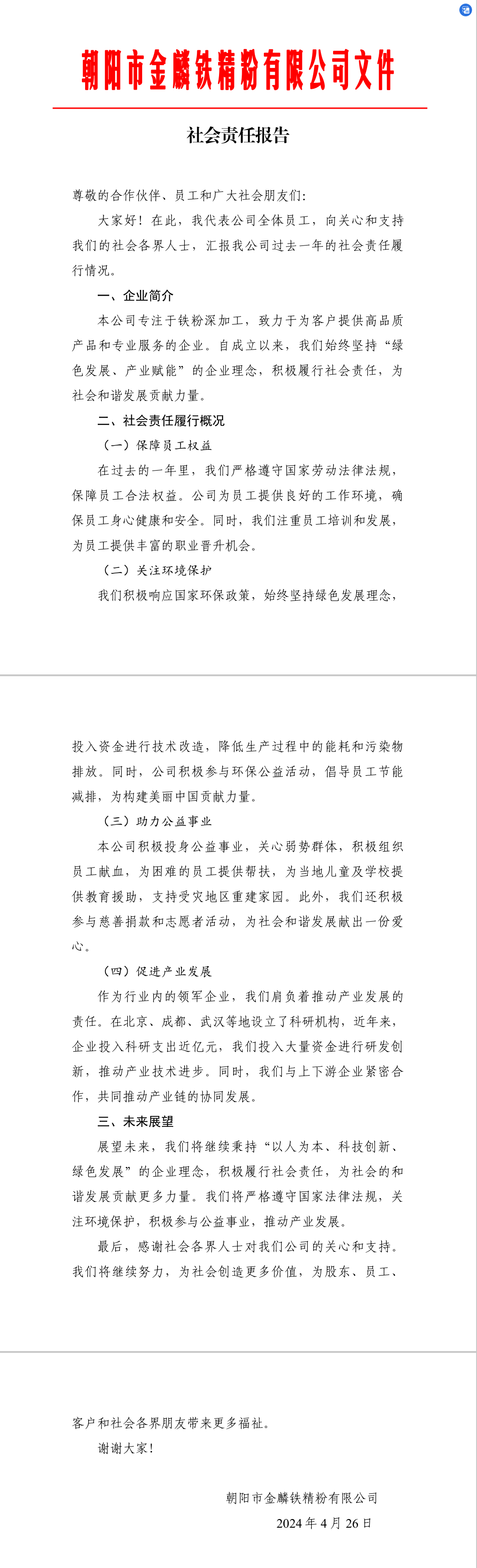 展望未來,我們將繼續(xù)秉持“以人為本、科技創(chuàng)新、綠色發(fā)展”的企業(yè)理念,積極履行社會(huì)責(zé)任,為社會(huì)的和諧發(fā)展貢獻(xiàn)更多力量。我們將嚴(yán)格遵守國家法律法規(guī),關(guān)注環(huán)境保護(hù),積極參與公益事業(yè),推動(dòng)產(chǎn)業(yè)發(fā)展。