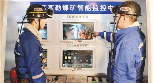 在山東能源淄礦集團(tuán)巴彥高勒煤礦綜采工作面智能化集控中心,6臺防爆電腦清晰顯示著工作面所有支架的壓力及狀態(tài)、采煤機(jī)的運(yùn)行參數(shù)、煤壁及支架視頻影像。它與地面集控中心的顯示器相連,可以在地面控制井下300米長工作面上的所有設(shè)備。職工“礦三代”趙昌圣點(diǎn)動鼠標(biāo),屏幕中采煤機(jī)滾筒迅速打開噴霧,連接運(yùn)輸機(jī)的順槽皮帶輸送機(jī)也隨之運(yùn)轉(zhuǎn)起來,隨著采煤機(jī)的推進(jìn),滾滾“烏金”順著順槽皮帶經(jīng)主井提升到地面。